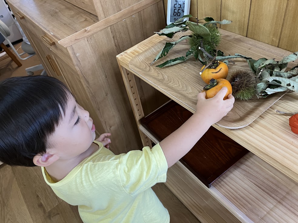 こどものいえに、柿と栗が届きました。枝に実が付いていて、栗もいがに入っていたり、中身がちらっと見えたりしていて、季節の木の実を感じられるものです。子どもたちは、そっと指先でいがを触ったり、柿の実の匂いを嗅いだりと、五感を使って堪能していました。
