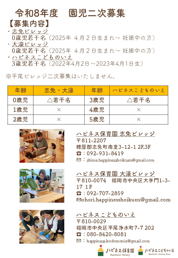 ハピネス保育園グループでは、令和8年度入園に向けて二次募集を開始いたします。