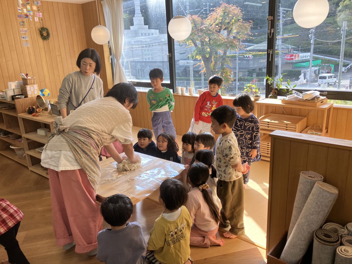 散歩から帰ると、できあがったうどんを見て声をあげるこどもたち。