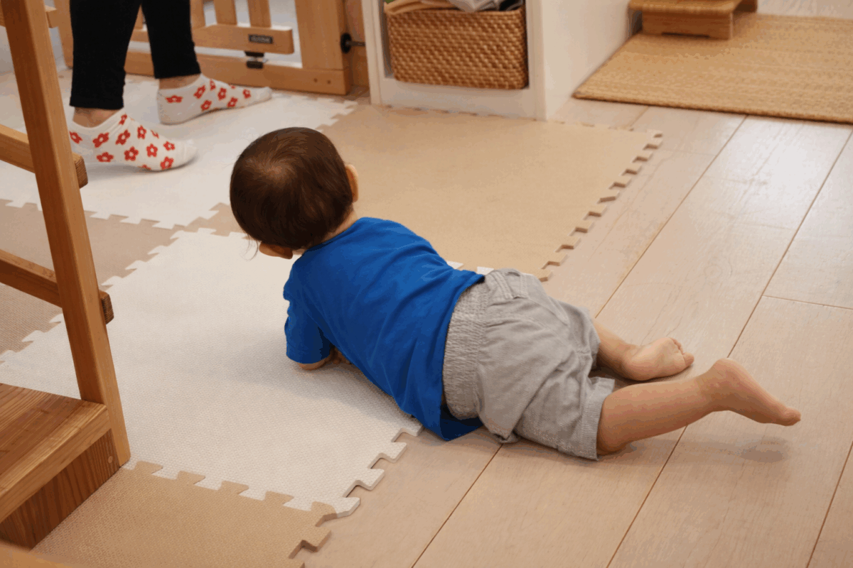 うつぶせになっても、しっかり顔をあげ、首もしっかり安定し、身体の動きと並行して、体幹もしっかりしてきました。近頃では、後ろに下がったり、足の指で床をしっかり蹴る動きも…♡